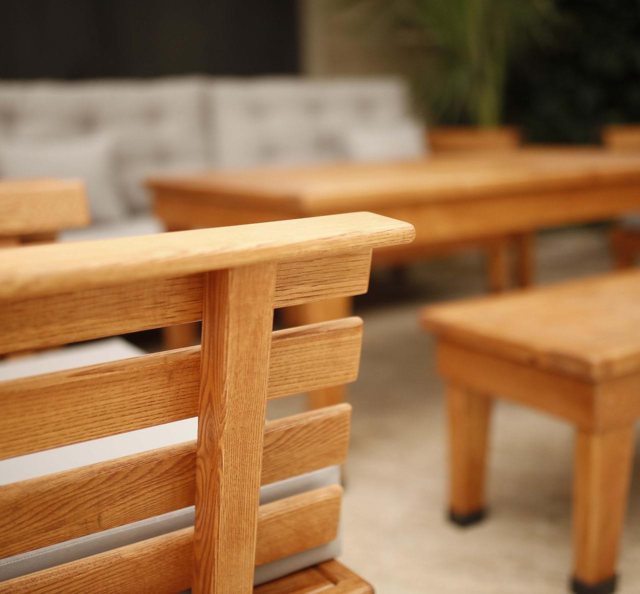 Oturma gruplarımızda kullanılan malzemelerin ve işçiliğin tamamının el işçiliği ve istihdamının yerli olması ile firmamız aynı sektörde hizmet veren rakiplerinden ayrılmakta ve bu anlamda firmaların önüne geçmektedir. Ürünlerimizin ahşap kısmı Karadeniz Bölgesine özgü KESTANE ağacından yapılmaktadır. Oturma kısmı oturma ve sırt (yaslanma) yeri olarak iki parçalıdır. Minder bölümünde ise silikon boncuk elyaf ve 10 cm sünger kullanılmaktadır. Ürün koruyucu olarak su bazlı dış mekan verniği kullanılmaktadır.